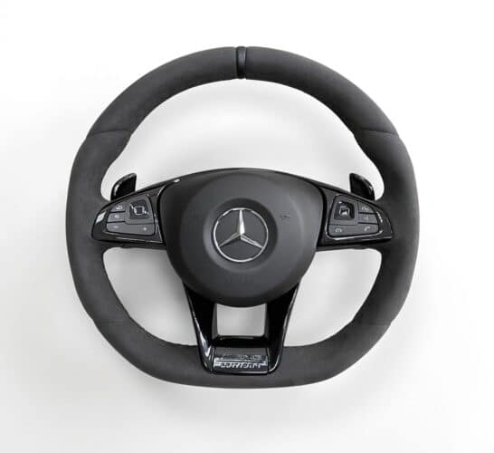 Виконали перетяжку кермового колеса в Mercedes-Benz E63 с использованием премиального материала Alcantara. Основной задачей было не только освежить внешний вид руля, но и добавить спортивный акцент в интерьер автомобиля.
