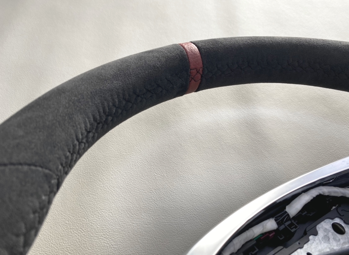 Представляємо вашій увазі проєкт із перетяжці керма Tesla Model S. У цій роботі ми створили ефектне поєднання розкішної шкіри Wollsdorf Nappa та спортивної Alcantara, доповнивши дизайн контрастною червоною нульовою позначкою в колір кузова.